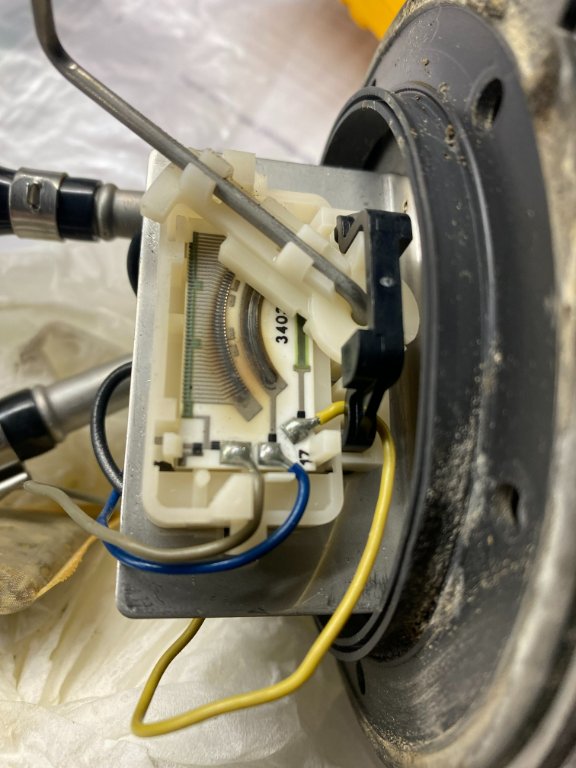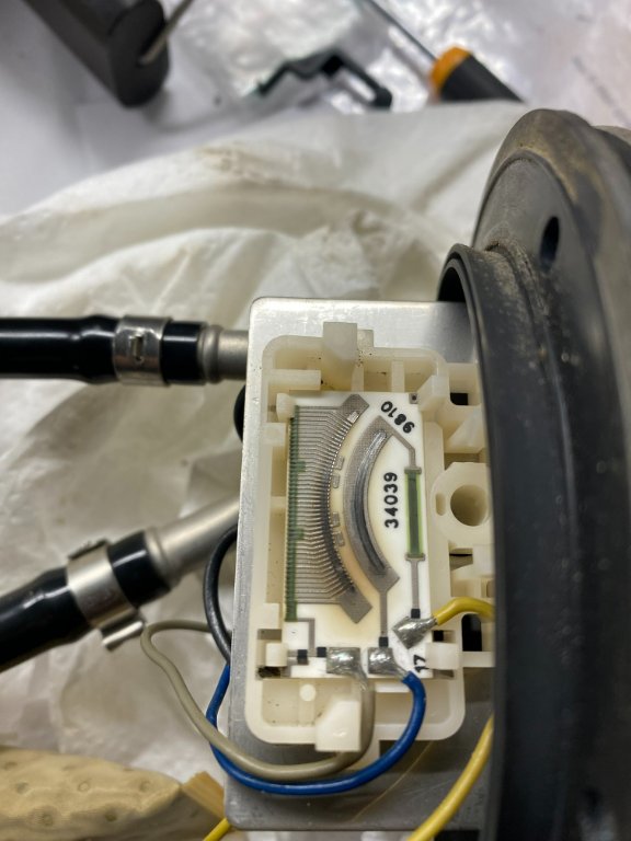 - När ytan är rengjord ser man tydligt att den är sliten. När jag Ohm mäter ser jag att jag tappar signalen i vissa lägen på skalan. Så i mitt fall måste jag byta ut givaren.